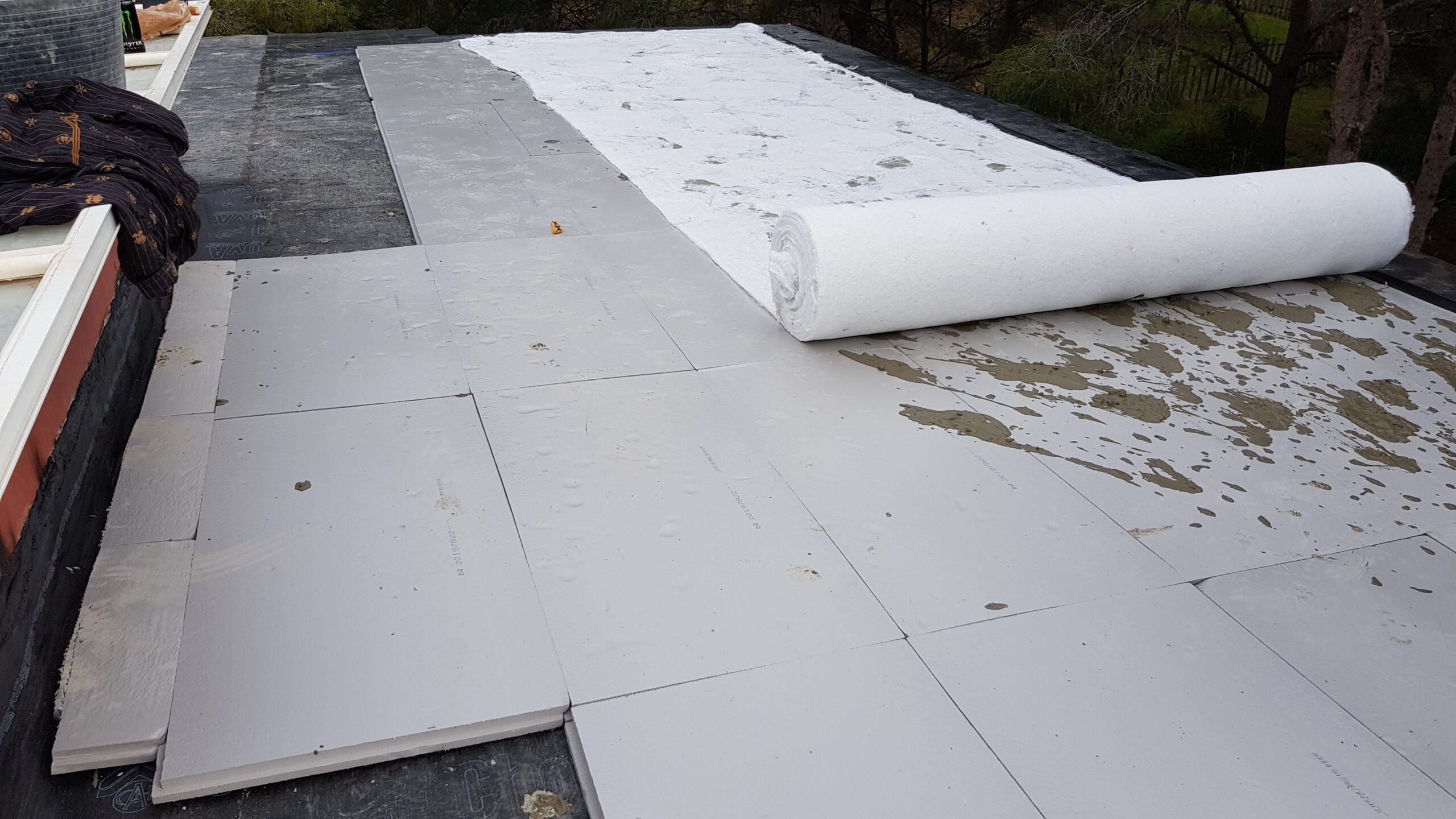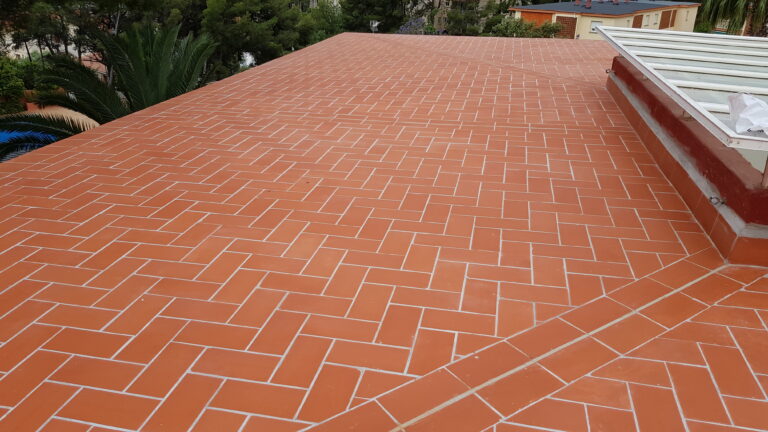 Impermeabilización total de cubierta comunitaria con doble tela asfáltica y aislamiento térmico de toda la superficie con protección de pavimento de rasilla de 14×28 cm.